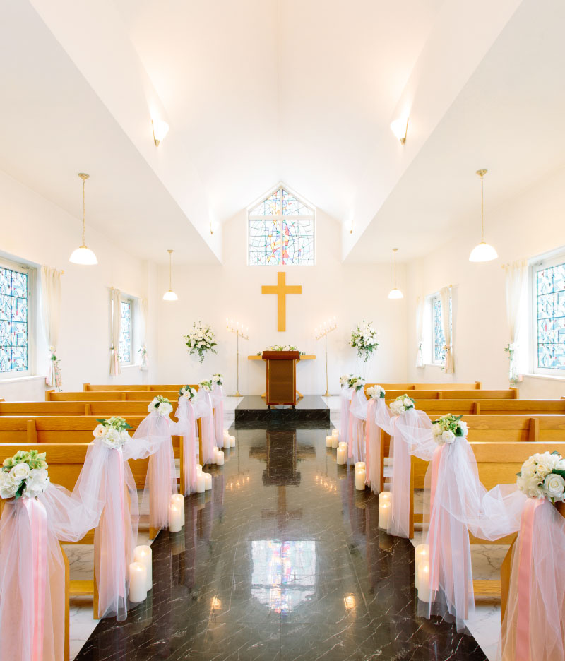 ステンドグラスから差し込む光がバージンロードを優雅に照らし出します。